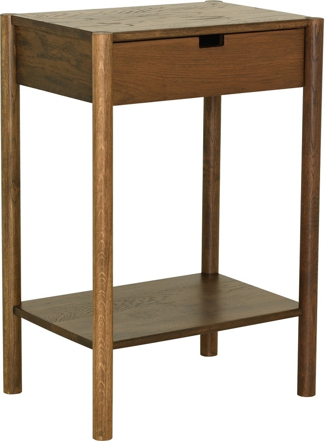 sängbord av brunlackad ek med förvaringslåda och hyllplan.