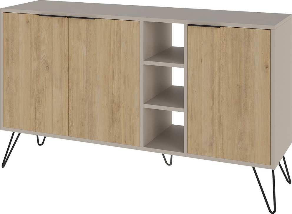 Skänk av melaminbelagd spånskiva med ben av metall.