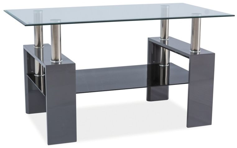 Ett fint soffbord med en modern design. Underredet är tillverkat av grå lackerad MDF och med detaljer av kromad metall. Bordsskivan är av härdat glas med en praktisk underhylla för smart förvaring.