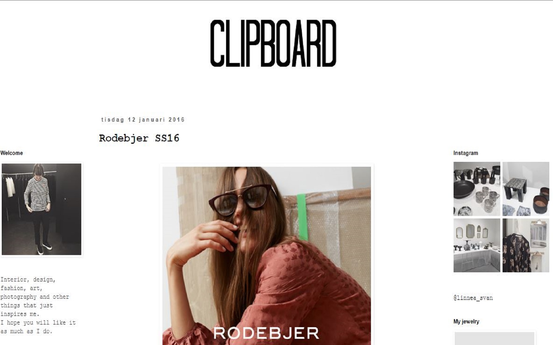 Att följa CLIPBOARD är som att flyta fram i vackert valda bilder som andas ett nästan komplentativt lugn, det märks att Linnéa också är mycket intresserade av fotografi. Färgerna svart, vitt, grafit och en gnutta mjuka nedtonade pasteller. Material i blickfånget är betong, metall och naturmaterial som skinn och trä. Mycket bygger på kontraster gammalt mot nytt, metall mot trä, mjukt mot hårt eller glas mot betong. Miljöerna är olika men känslan genomgående.