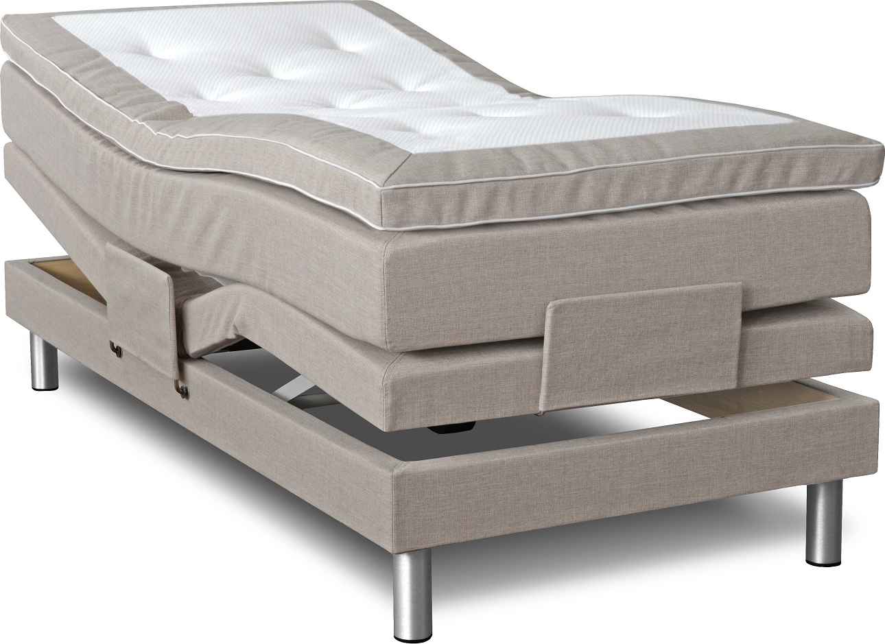 Cloud ställbar säng levereras med en 8 cm hög exklusiv bäddmadrass. Sängen är klädd i ett sandfärgat slitstarkt tyg (Inari 22).