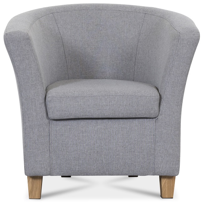 Klassisk clubfåtölj med skön sittkomfort och bra tilltagna mått. Massiva träben. Levereras i ett slitstarkt ljus grått tyg.