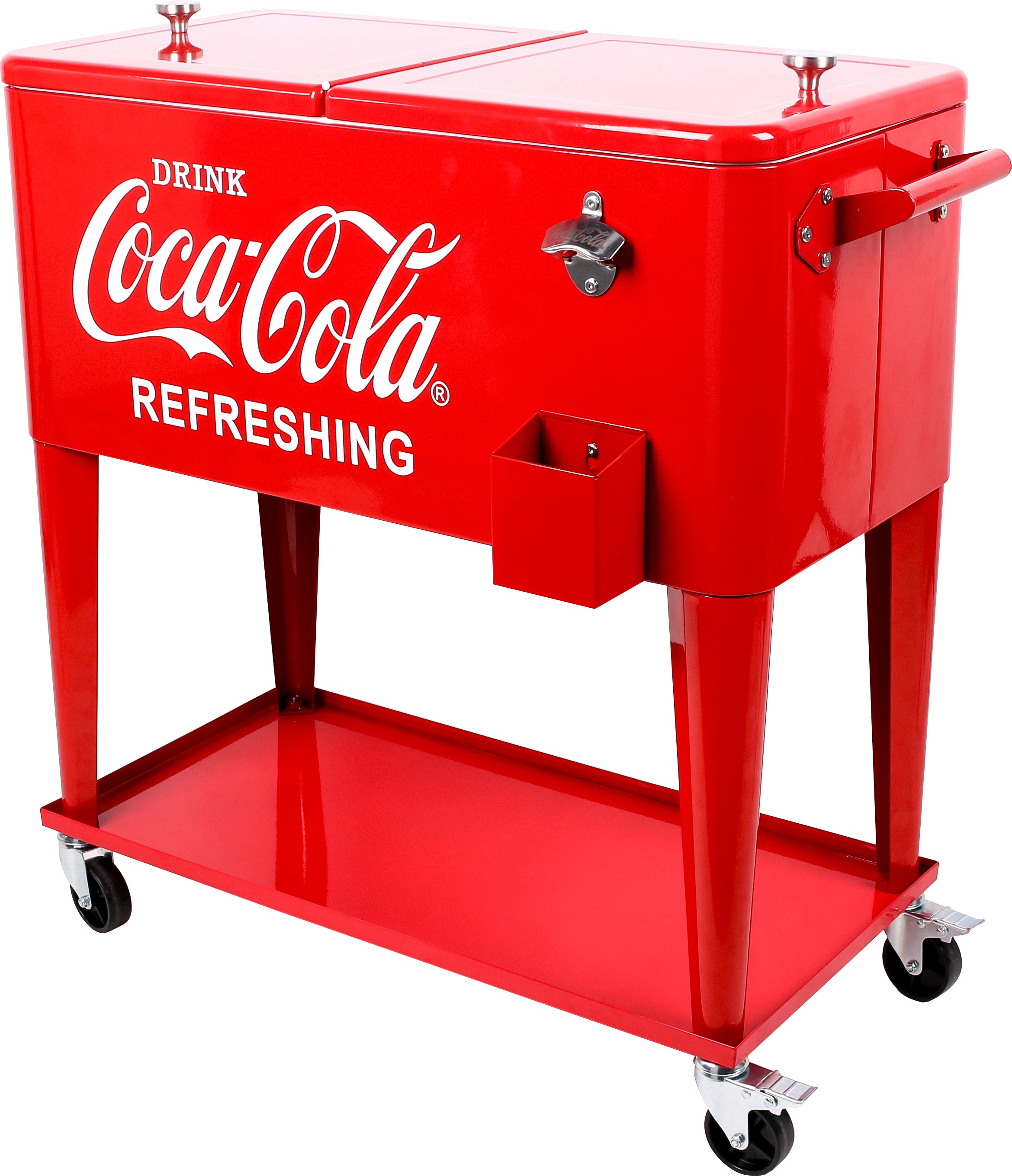 Licensierad Cola-Cola dryckeskyl på hjul. Med fastmonterad kapsylöppnare samt uppsamlare för kapsyler. Avrinningskran för smältvatten.