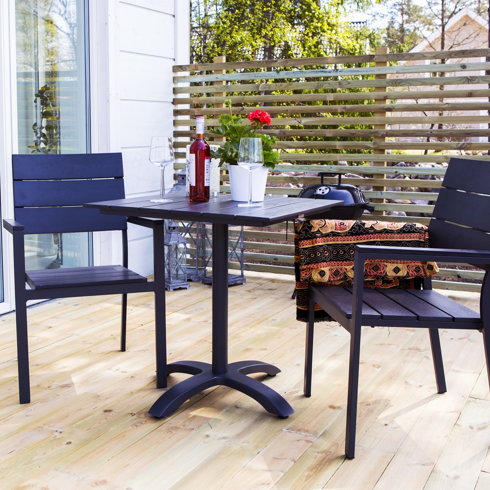 Ett harmoniskt cafébord för sommarens måltider! Colorado är ett klassiskt kvadratiskt matbord i nätt design och storlek. Bordet är tillverkat i svart slitstarkt aluminium och aintwood, vilket gör att det lämpar sig perfekt för utomhusbruk. Matcha med ett par snygga matstolar så är fikastunden i sommar räddad! Mått: 70x70 cm.