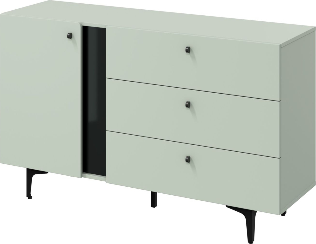 Byrå av trä med ben och handtag av metall. Levereras omonterad.