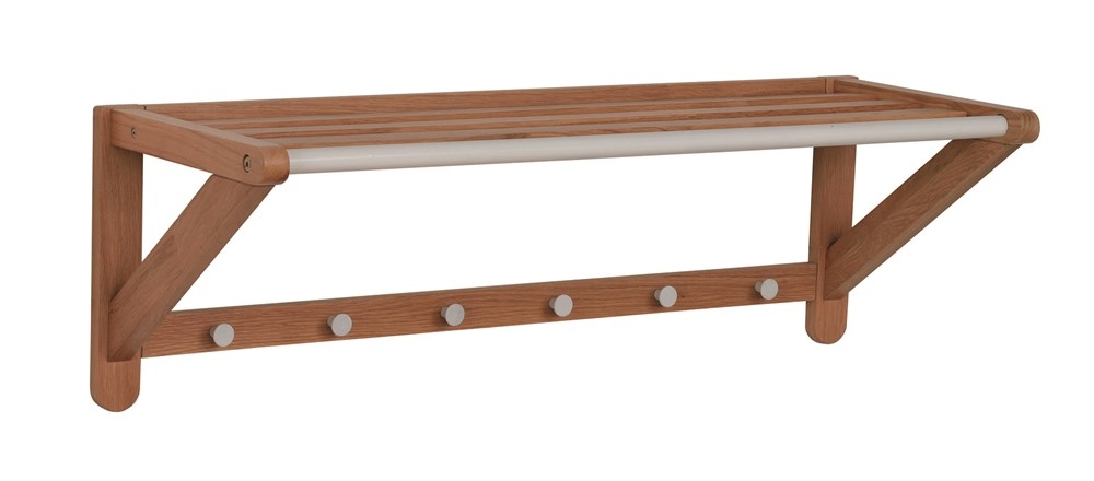 Snygg och enkel hatthylla i massiv och fanerad lackad ek. Hyllplan samt 6 st krokar i silverfärgad metall. Ingår i serien Confect.
