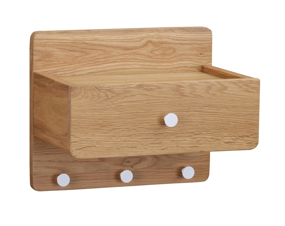 Liten och nätt hylla i lackad ek. Hyllan har en skålad avlastningsyta samt en låda och tre krokar. Alla beslag är i svart metall. Hyllan ingår i vår hallserie Confect.