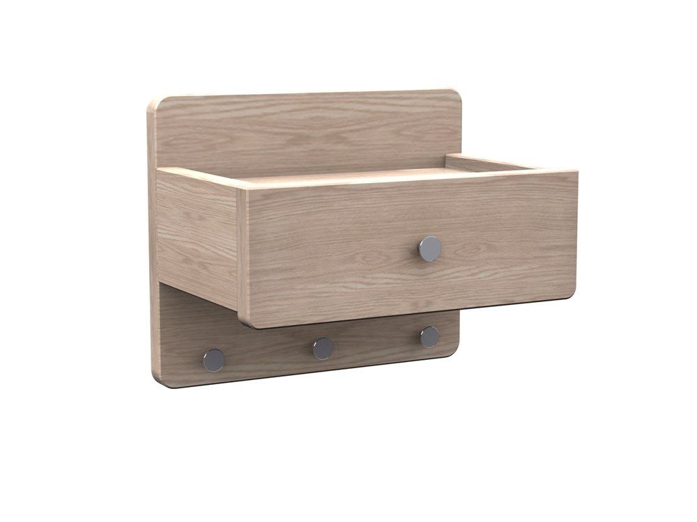 Confect hylla i massiv vitpigmenterad ek. Krokar i silverfärgad metall samt en skålad avlastningsyta. Hyllan ingår i vår hallserie Confect.