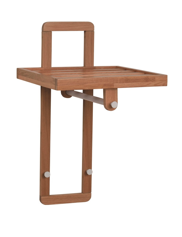 Confect klädhängare i massiv och fanerad lackad ek. Klädhängaren har en hylla samt en stång i metall med plats för galgar och små krokar i metall. Klädhängaren ingår i vår serie Confect.