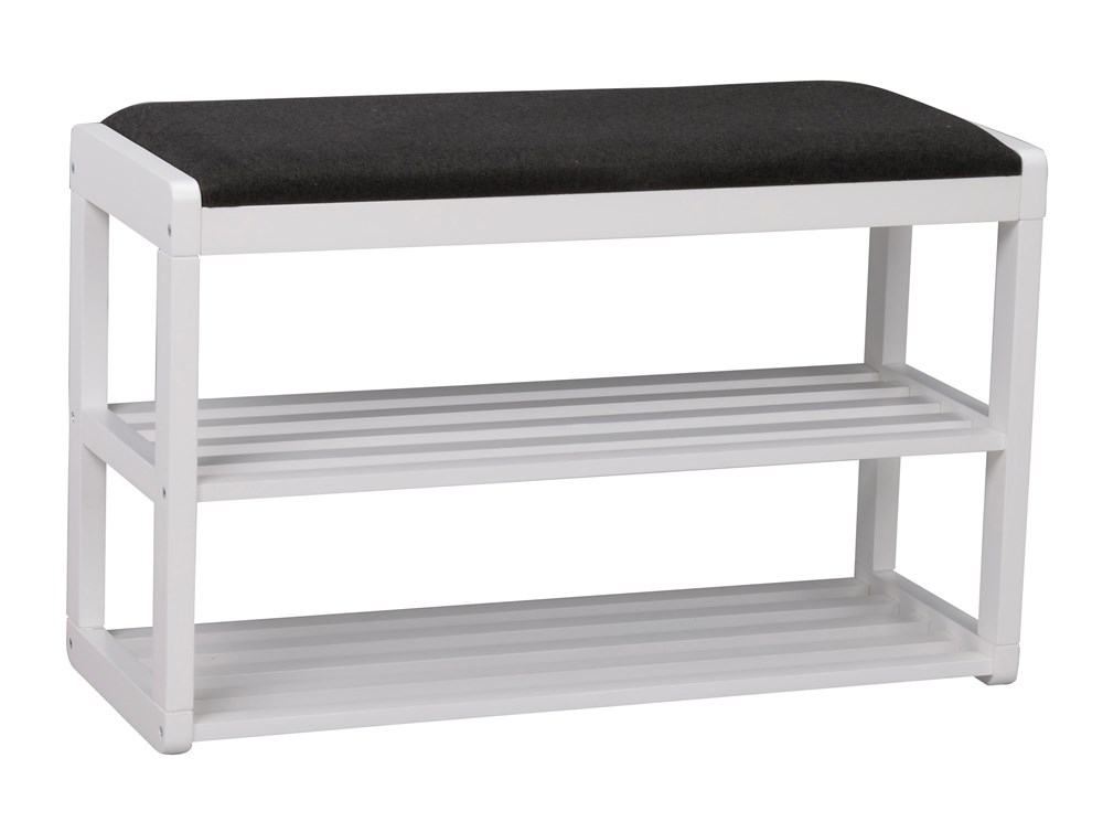Stilren och praktiskt skoställ och sittbänk i ett. Massiv vitlackad björk och vitlackad MDF. Skostället har två hyllor samt en skön mörkgrå sittdyna. Ingår i vår serie Confect.