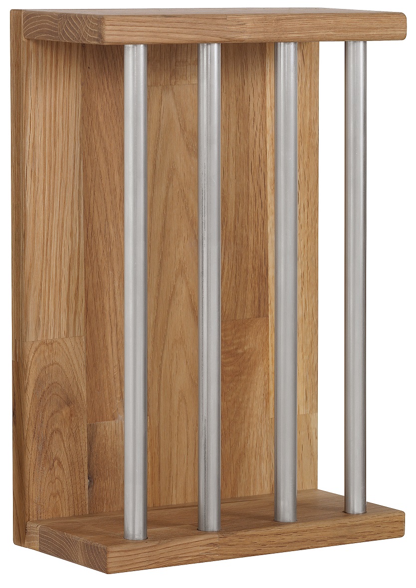 Ett fint vägghängt sängbord i massiv ek med metalldetaljer. Sängbordet är endast 10 cm djupt vilket gör det till ett mycket stilrent och nätt sängbord. Placera tidningar i hyllan och använd den som ett tidingsställ.