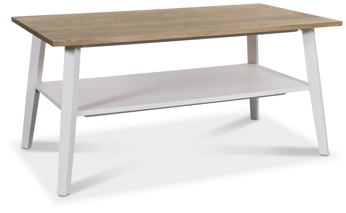 Massivt rektangulärt soffbord i skandinavisk design som passar in i de flesta vardagsrum. Vitlackad stomme med fanerad bordsskiva i oljad ek för längsta hållbarhet. Praktisk hylla för förvaring av tidningar och fjärrkontroller!