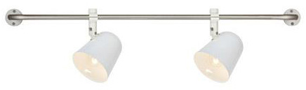 Vägglampa Conrad med en stilig design. Tillverkad i stål med vita lampskärmar. Lamphuvudena är justerbara i sid- och höjdled. Ställbart huvud. Separat strömbrytare på varje lamphuvud. Liten sockel (E14) Max 40W eller motsvarande i halogen, lågenergi eller LED. 2 meter sladd. Lampan är mycket lätt monterad och passar perfekt in i flera olika miljöer i hemmet.