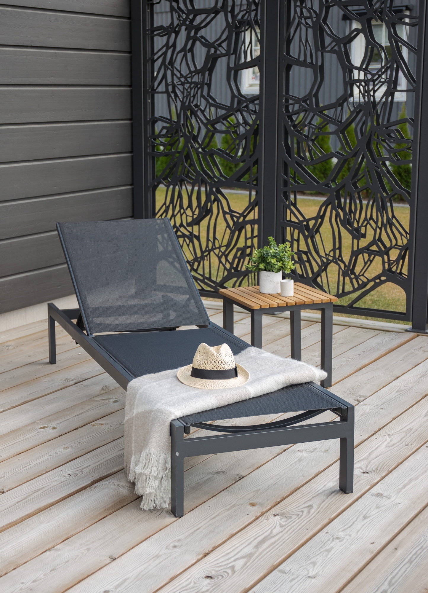 Den svarta aluminiumramen ger solbädden en sofistikerad och minimalistisk look, medan det slitstarka textilene-materialet ger både hållbarhet och komfort. Den tidlösa färgen gör att solbädden enkelt passar in i alla typer av utomhusmiljöer, från trädgårdar och terrasser till poolområden.