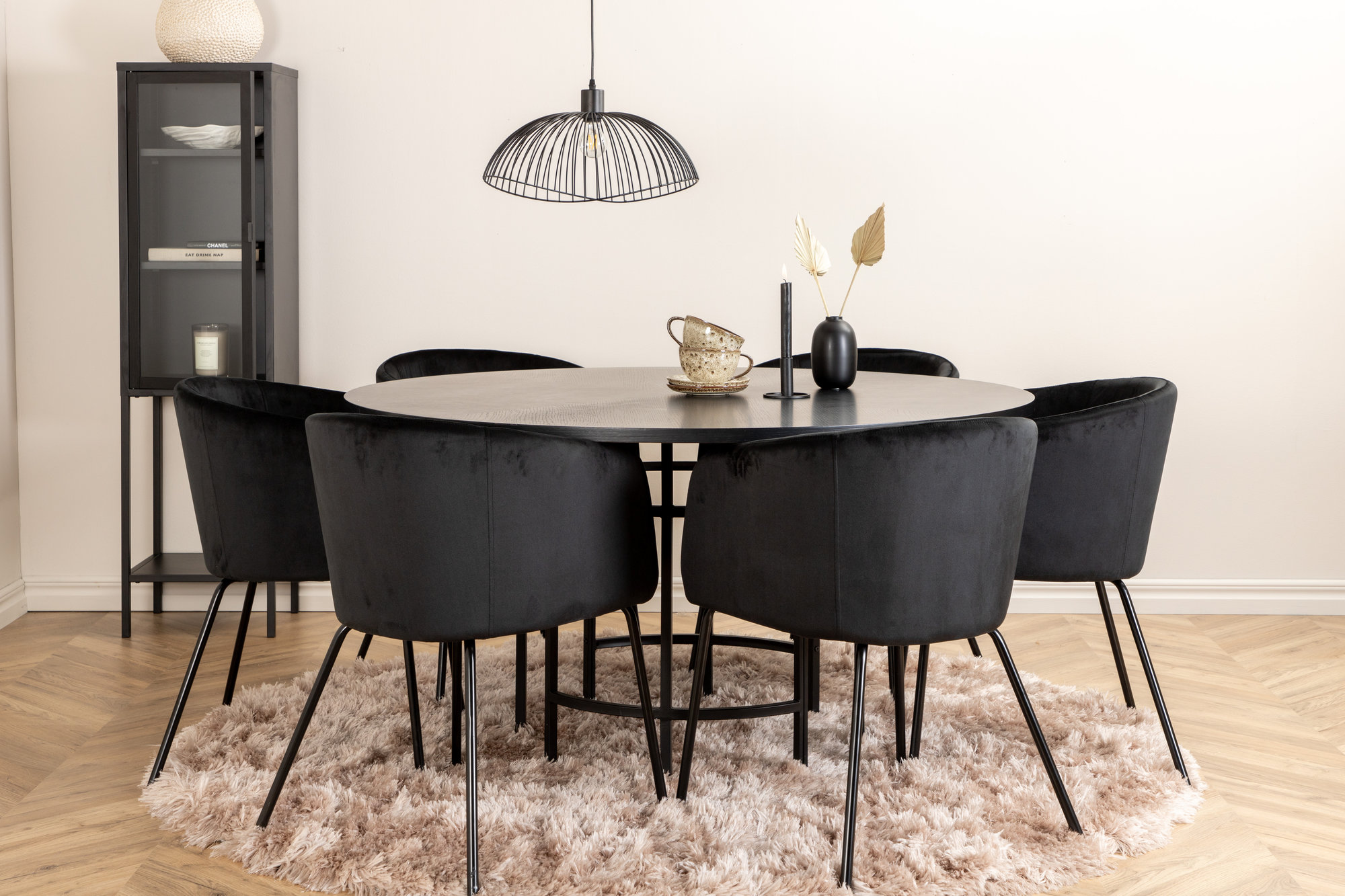 Copenhagen matbord har en enkel och stilren design i svart, med en bordsskiva i MDF och faner. Underredet är cylinderformat och tillverkat i metall för extra hållbarhet. Tillsammans med Berit matstolar, som har en komfortabel sits i svart sammet och smala stolsben i järn, får du en praktisk och modern matgrupp för hemmet.