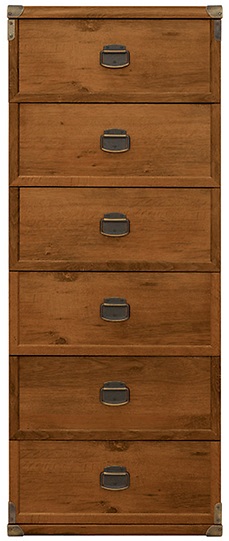 En fin byrå med sex lådor i kolonialstil med metallbeslag och metallhandtag. Då byrån är smal och hög passar den utmärkt att ha i en hall eller ett mindre utrymme.