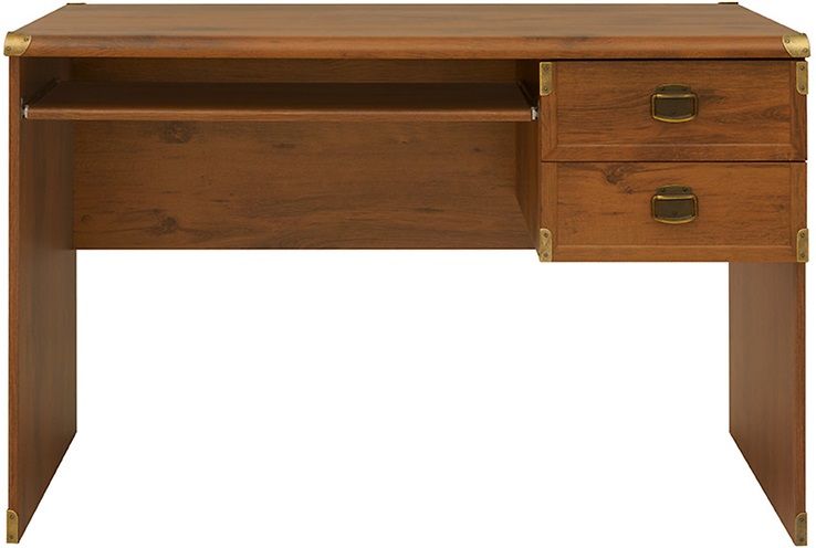 Ett fint skrivbord i kolonialstil med metallbeslag och metallhandtag. Undertill finns det en vågrät skiva som skyddar väggen mot smuts men stabiliserar även skrivbordet. Med de två lådorna finns det möjlighet att förvara mindre saker. En tangentbordshyllan gör så att man slipper onödiga saker på bordsytan.