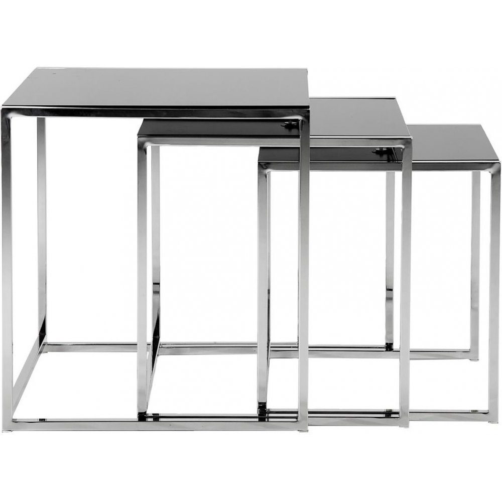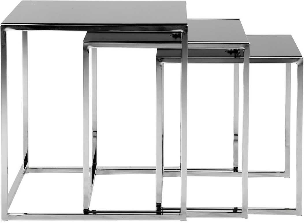 Trevligt och modernt satsbord från vår Cross serie, ett perfekt tillval att pynta hemmet med. I setet ingår tre bord. Bordsplattan är gjord av svart glas och benen är av kromad metall.
