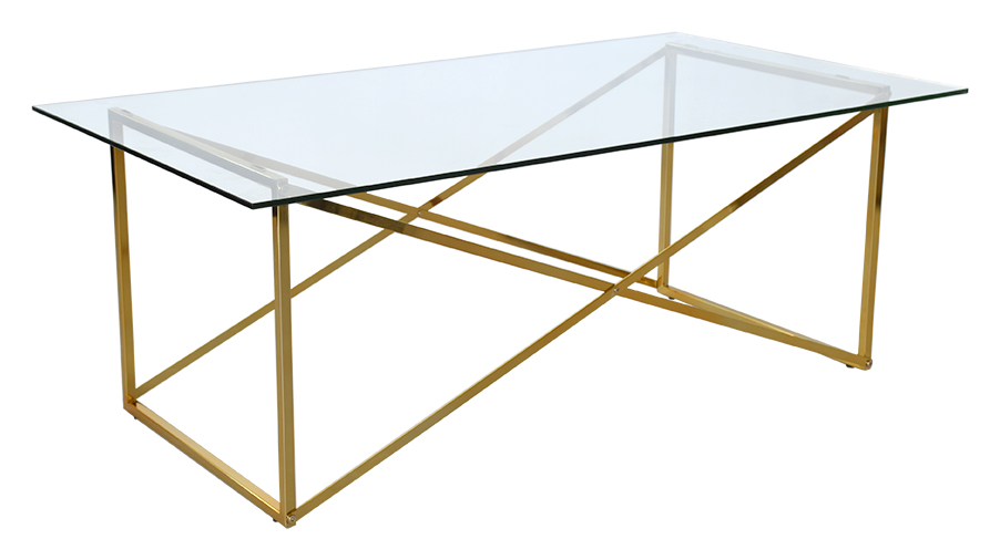 Cross, ett lättplacerat soffbord i Art deco-stil. Bordsskiva i glas och underrede i blankt mässingsutförande!