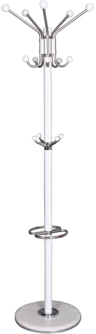 En snygg tamburmajor med en klassisk design. Klädhängaren är tillverkad av kromad metall med detaljer i vitt trä, med ett flertal krokar i olika höjdlägen.