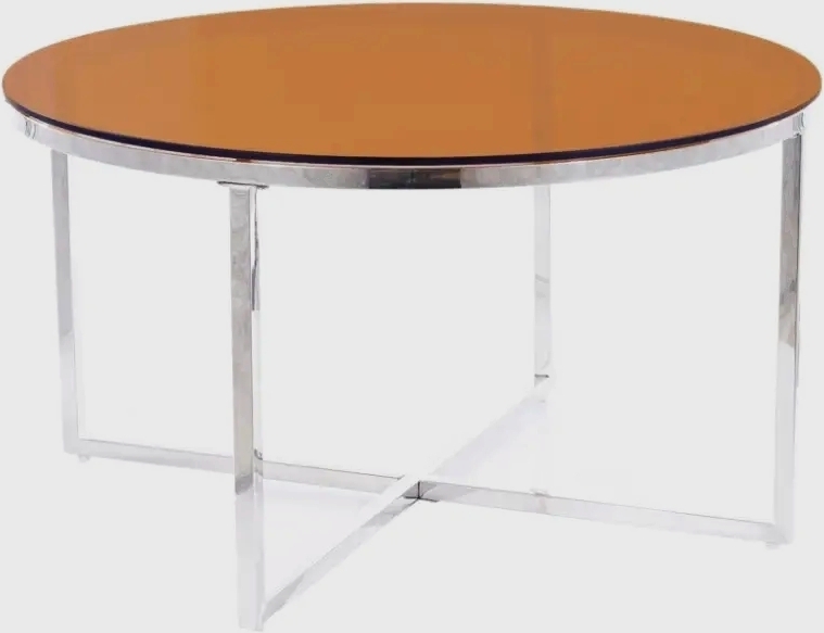 Soffbord av rostfritt stål. Bordsskiva av tempererat glas.