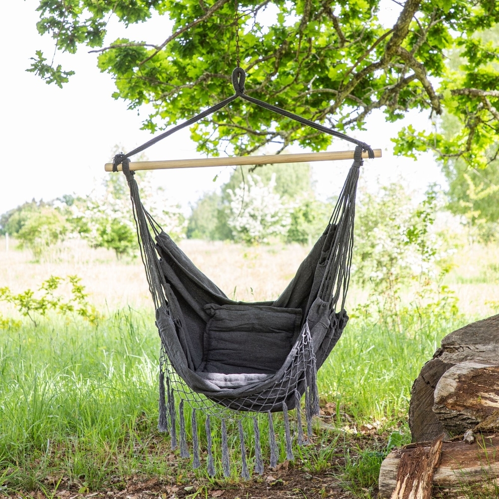 Den här hammocken erbjuder dig en rofylld och bekväm plats som du kan avnjuta i trädgården. Culasi har en inbjudande utformning och trendig design med en sits i grått polyester- och bomullstyg. De slitstarka repen hålls uppe av en dekorativ träpinne som blir en snygg detalj i blickfånget. Här kan du gunga och njuta av stillsam egentid!