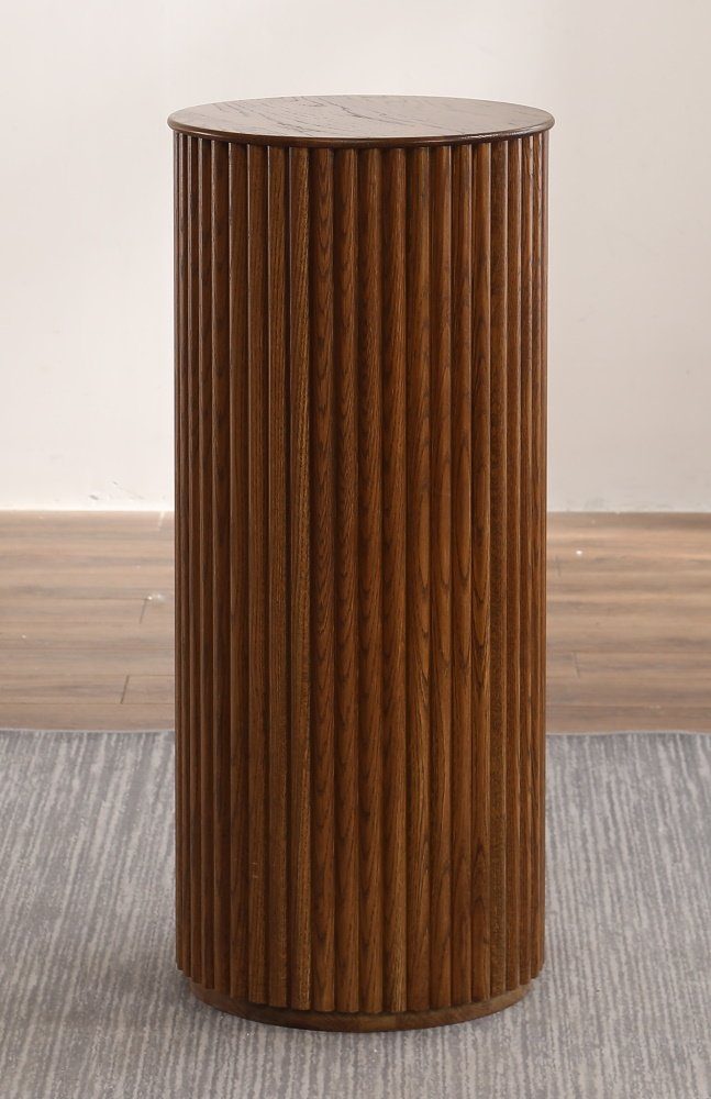 Prydligt cylinderformad piedestal, uppbyggt av massiva ekstavar samt en massiv kantlist, toppskiva av valnötsbetsad fanér.