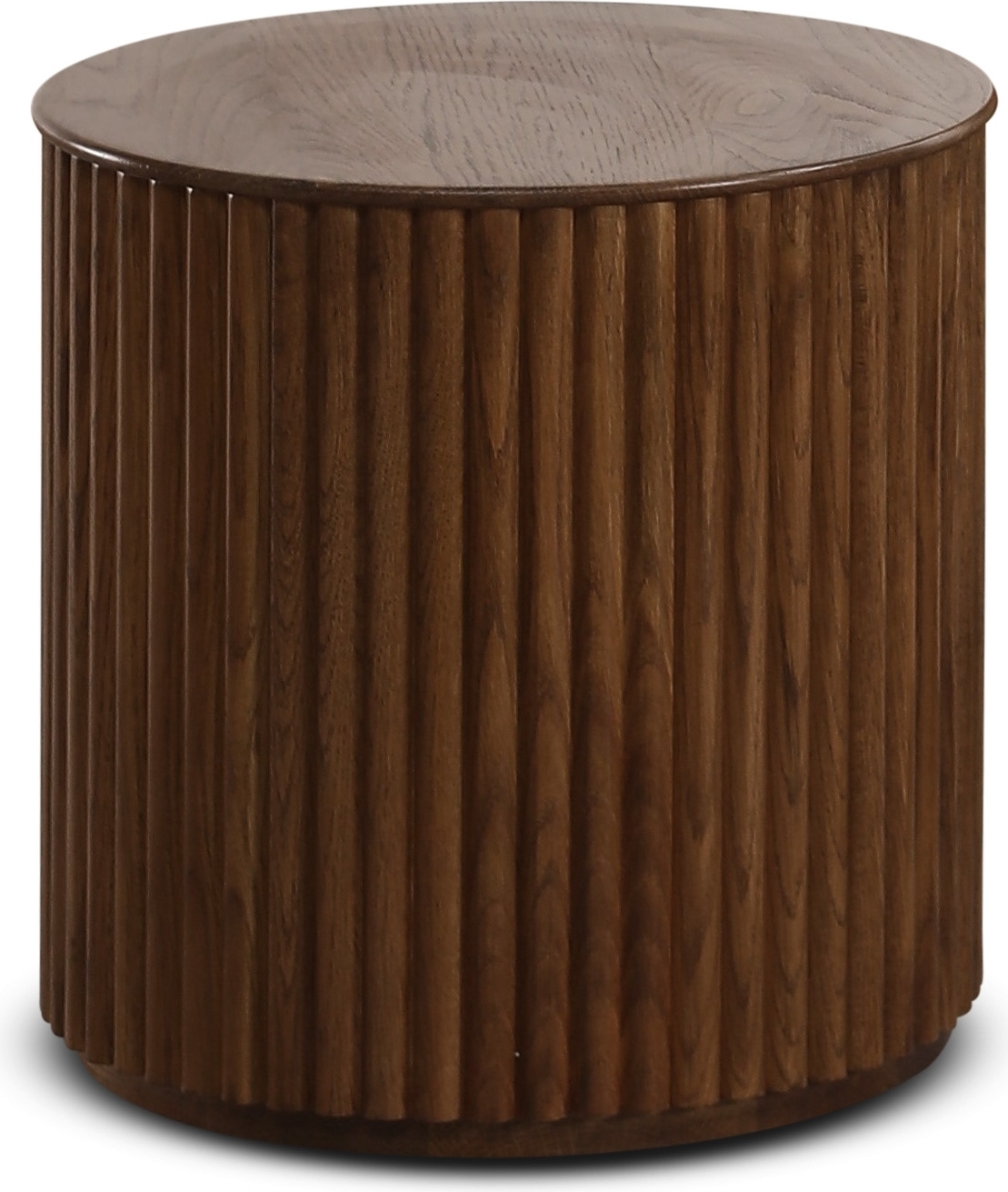 Prydligt nätt cylinderformat sidobord, uppbyggt av massiva ekstavar samt en massiv kantlist, toppskiva av valnötsbetsad fanér.
