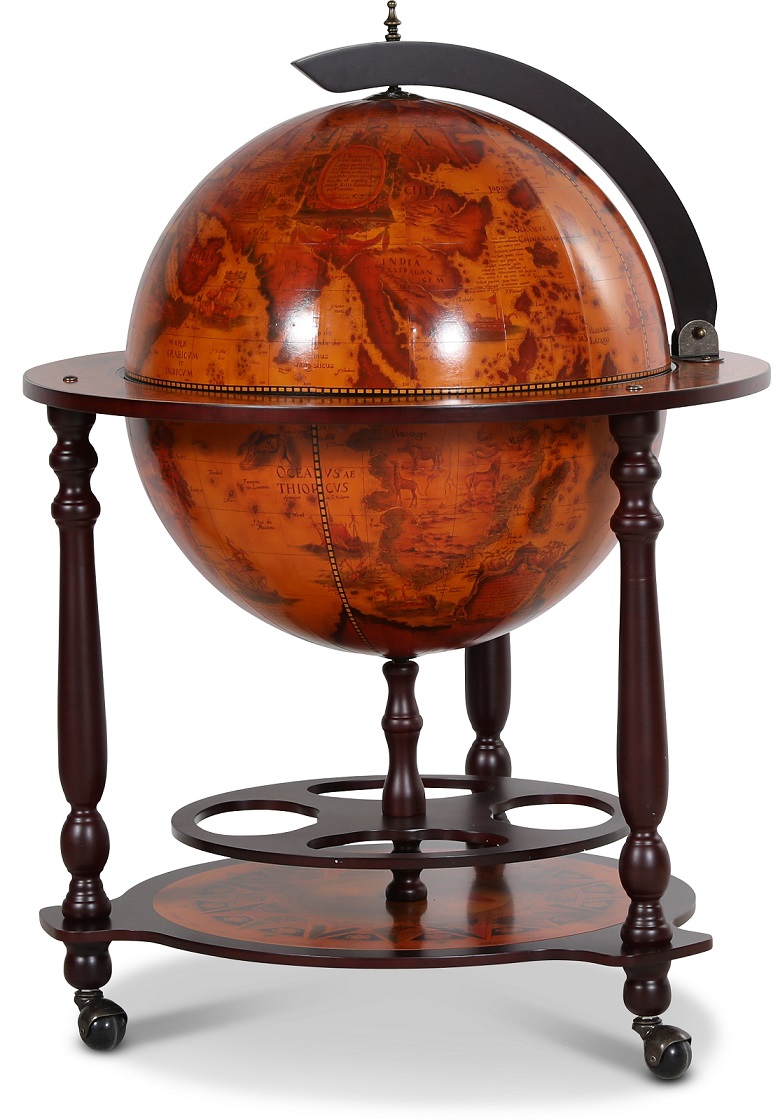 Klassiker inom inredningsvärlden. Bargloben med förvaring för glas och flaskor, hjul för att kunna förflytta den lätt. 68 cm i diameter totalt. Höjd 111 cm.