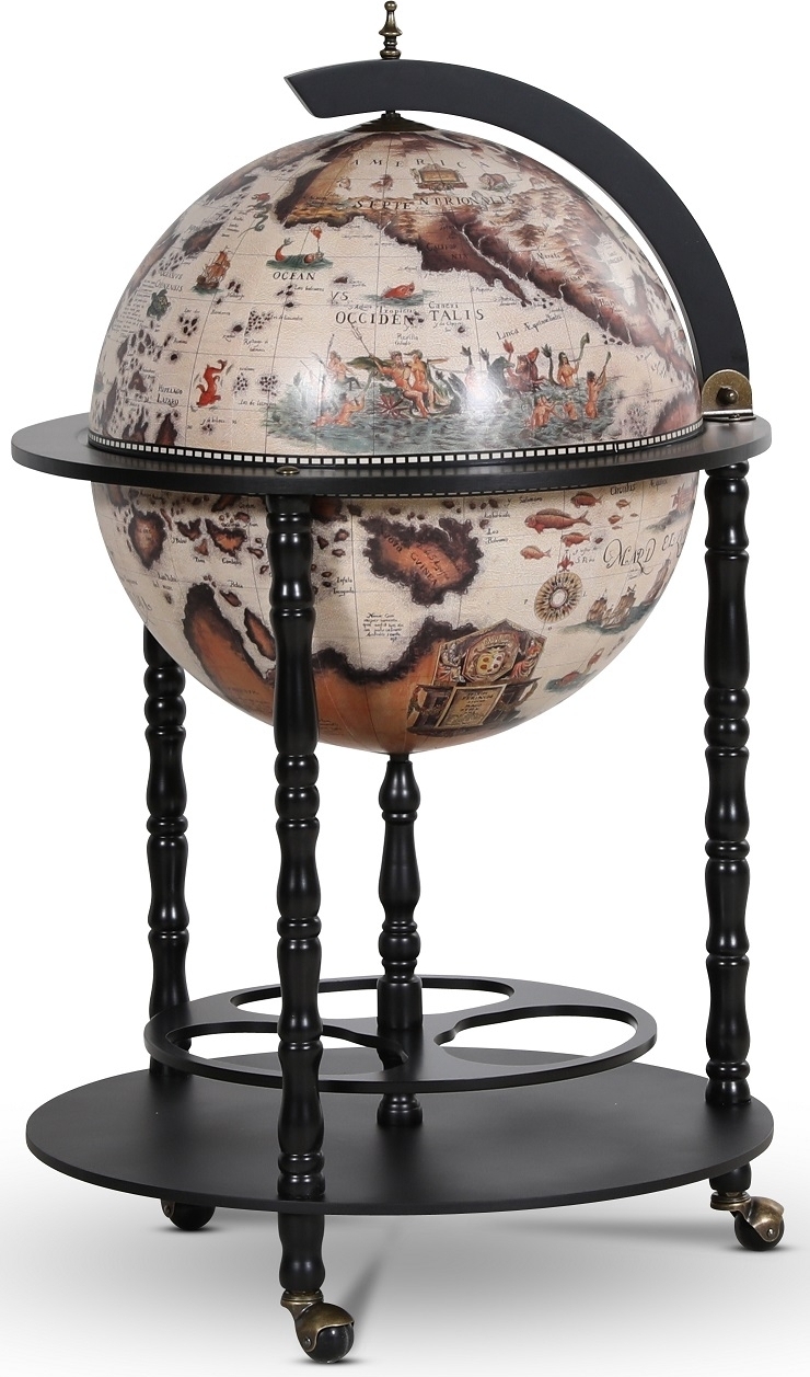 Klassiker inom inredningsvärlden. Bargloben med förvaring för glas och flaskor, hjul för att kunna förflytta den lätt. 55 cm i diameter totalt. Höjd 93 cm.