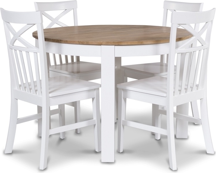 Matgrupp från Skånska Möbelhuset, Runt matbord med vitlackat underrede och bordsskiva i massiv oljad ek. Fyra stycken Klassiska Mellby matstolar i vitlackat trä.