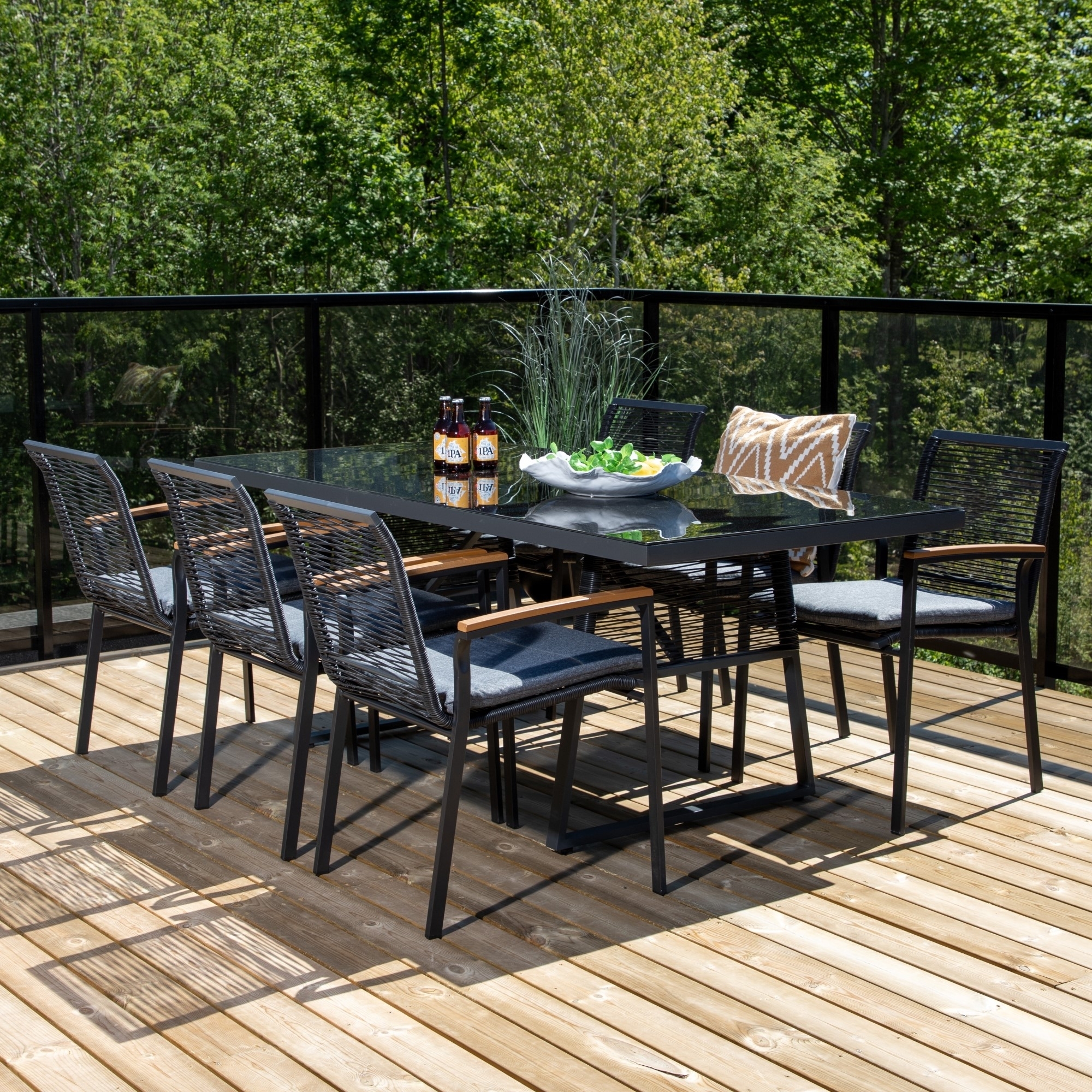 Dallas är ett rektangulärt matbord tillverkat i svart aluminium. Bordsskivan är i mörkt glas, bordsstommen har schyssta repdetaljer som ger bordet ett kaxigt och smakfullt uttryck. Matcha med stolar i samma serie för en komplett matgrupp. Gör dig redo för härliga sommarstunder tillsammans med familj och vänner! Skötselråd: Utemöbler i aluminium och rostfritt stål bör rengöras regelbundet med vatten och mild tvål. Skölj alltid noggrant med rikligt med vatten, något som blir extra viktigt om möblerna är placerade på ett havsnära avstånd där salt kan transporteras via luften.