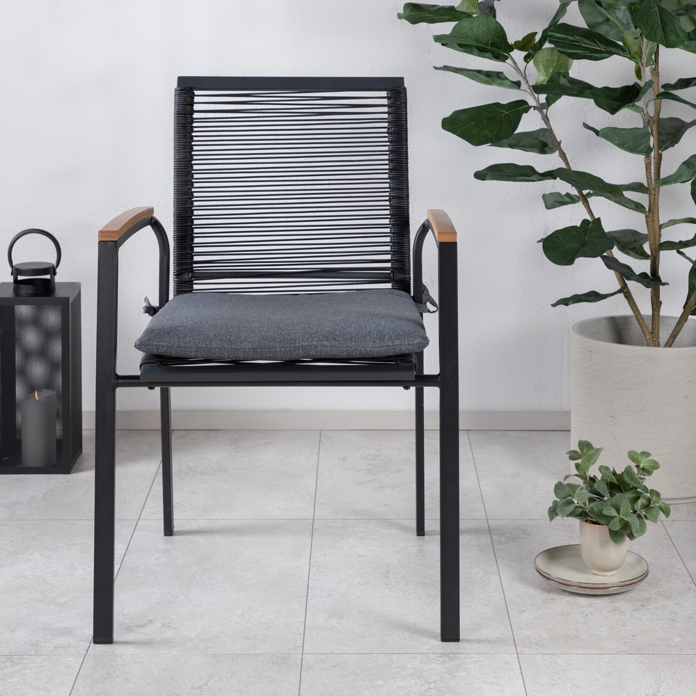 En lika praktisk som iögonfallande matstol från serien Dallas passar utmärkt till sommarens måltider! De träfärgade armstöden blir en omtyckt detalj som skapar en schysst helhetsdesign tillsammans med de svarta repen. En slående favorit på många uteplatser! Stolen är stapelbar. Skötselråd: Våra rep är kvalitetsspunna polyesterrep som är lätta att rengöra. Möblerna är behandlade för att klara 500-2000 timmar. Vi rekommenderar såpa och vatten för rengöring. Låt lufttorka. För de områdena som är svårare att komma åt kan en liten borste användas försiktigt. Använd aldrig högtryckstvätt eller starka kemikalier för att rengöra repet.