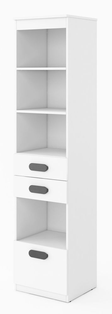 En snygg bokhylla med en modern design. Tillverkad i MDF med högglans vit front och goda förvaringsmöjligheter i form av fyra hyllplan och tre förvaringslådor.