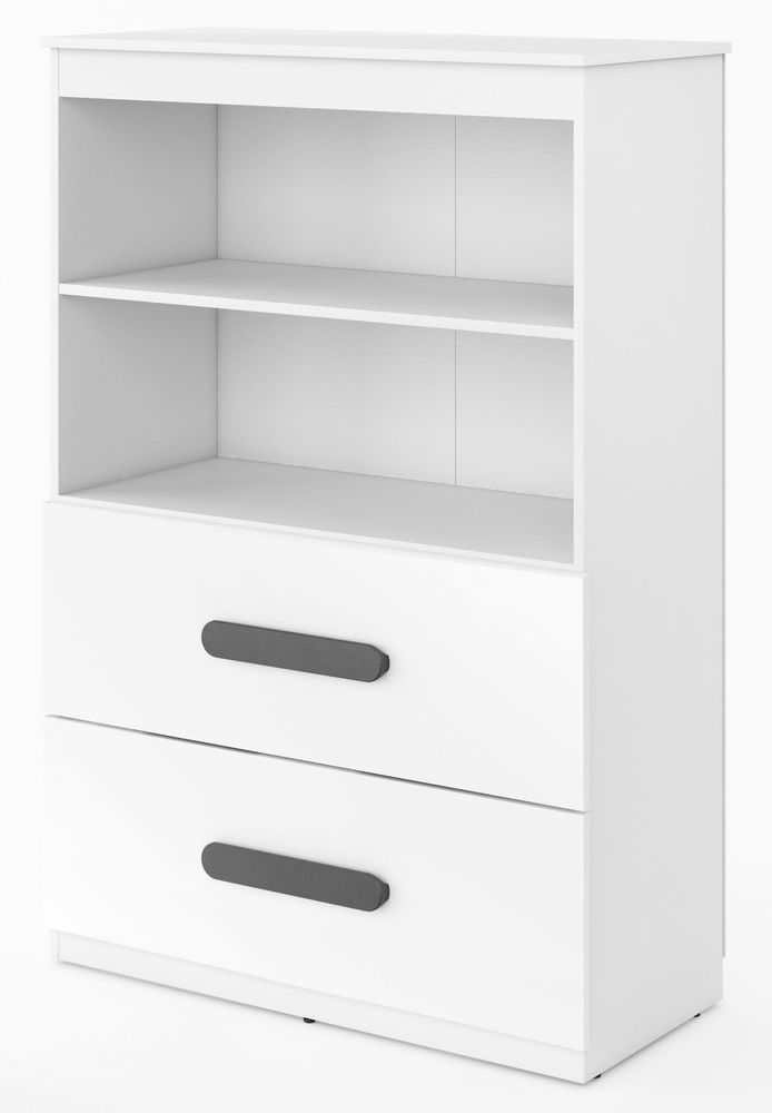 En snygg bokhylla med en modern design. Tillverkad i MDF med högglans vit front och goda förvaringsmöjligheter i form av två breda hyllplan och två förvaringslådor.