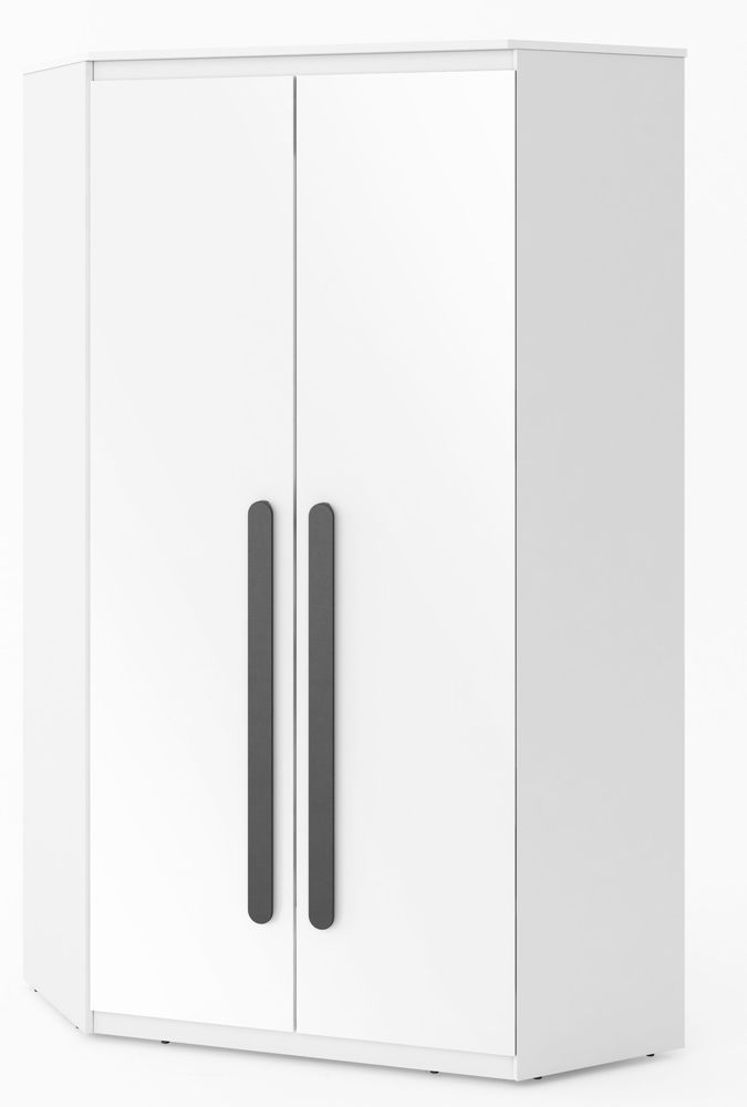 En snygg hörn garderob med en modern design. Tillverkad i MDF med högglans vit front och mycket goda förvaringsmöjligheter i form av klädstång och hyllplan.