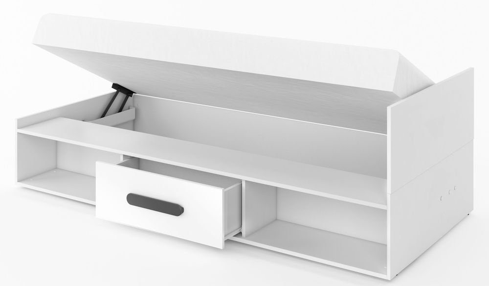 En mysig säng med en modern design. Tillverkad i MDF med goda förvaringsmöjligheter i form av två öppna utrymmen och en låda på sidan av sängen, samt kan man lätt lyfta upp madrassen för att visa ett utrymme som med kan användas som smart förvaring.