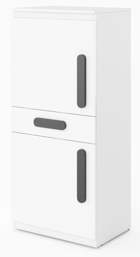 Ett snyggt förvaringsskåp med en modern design. Tillverkad i MDF med högglans vit front och goda förvaringsmöjligheter i form av två skåp med hyllplan och en låda.
