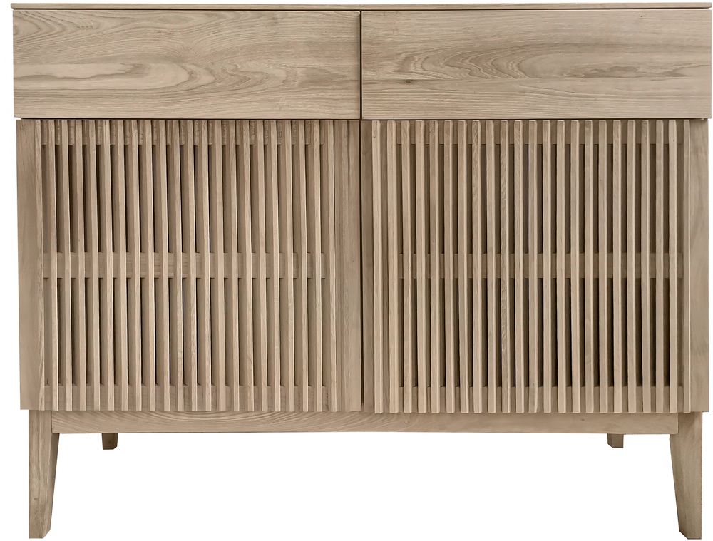 Darell serie innehåller en rad olika vitrinskåp och sideboards. Detta skåp är tillverkat av askfanér (MDF) förutom dörrar och underrede som är av massiv ek.