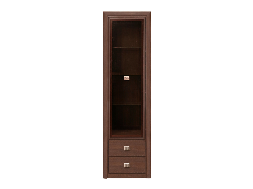En fin bokhylla i brun ek med silvriga handtag och en dörr i härdat glas. Bokhyllan har många förvaringsmöjligheter då den både har hyllplan och två mindre lådor.