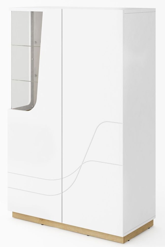 Ett snyggt förvaringsskåp med en modern design. Tillverkat i MDF med högblank vit front och utskurna linjer. Ena hörnan har ett glasfönster med LED belysning så du kan på ett snygg vis placera prydnader för display. Dörrarna har push-open/soft-close funktion.