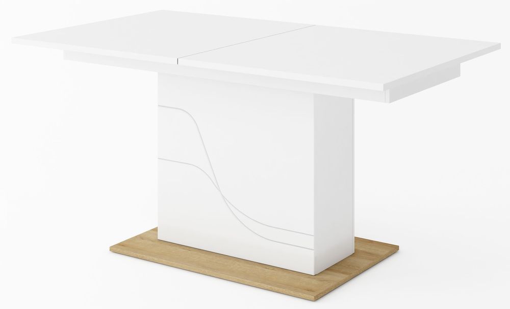 Ett snyggt och modernt matbord, tillverkat i MDF med högblank vit bas med utskurna linjer. Bordet är praktiskt då du lätt kan förlänga bordet från 160 cm till 200 cm.