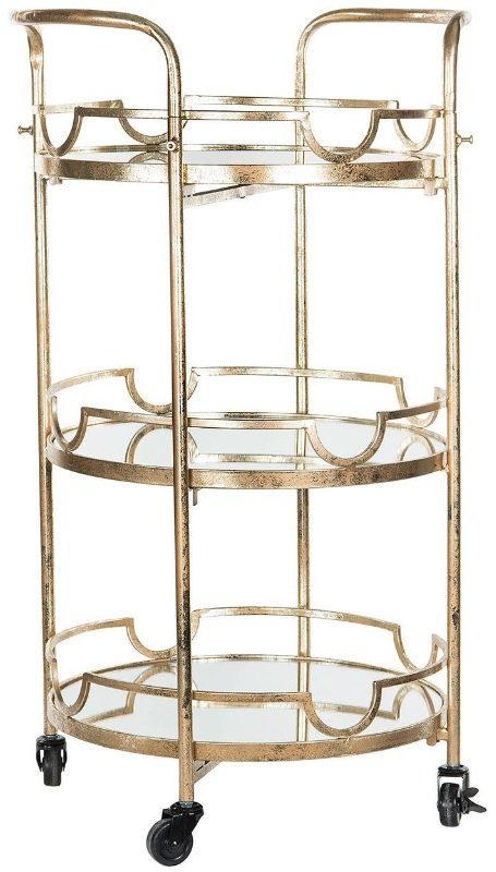 En traditionell serveringsvagn med en art deco design. Serveringsvagnen har tre stycken spegelhyllplan. Vackra detaljer och låsbara hjul.