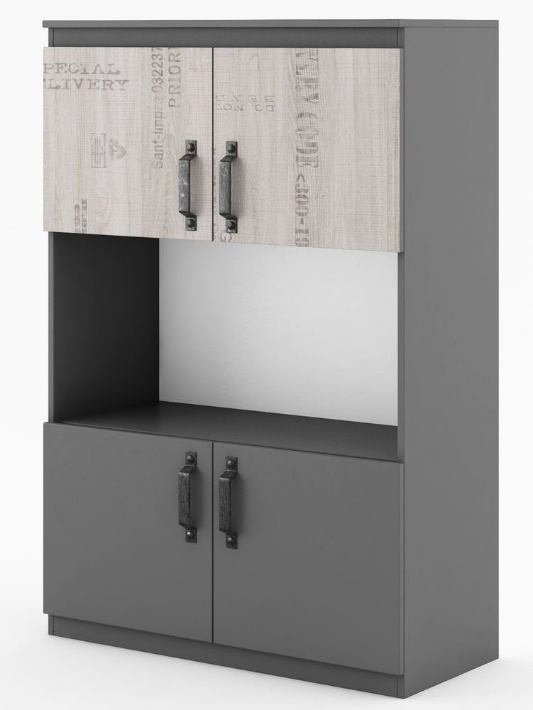 Ett snyggt och praktiskt förvaringsskåp med en modern design. Tillverkad i MDF med goda förvaringsmöjligheter i form av fyra skåp och ett stort öppet hyllplan.