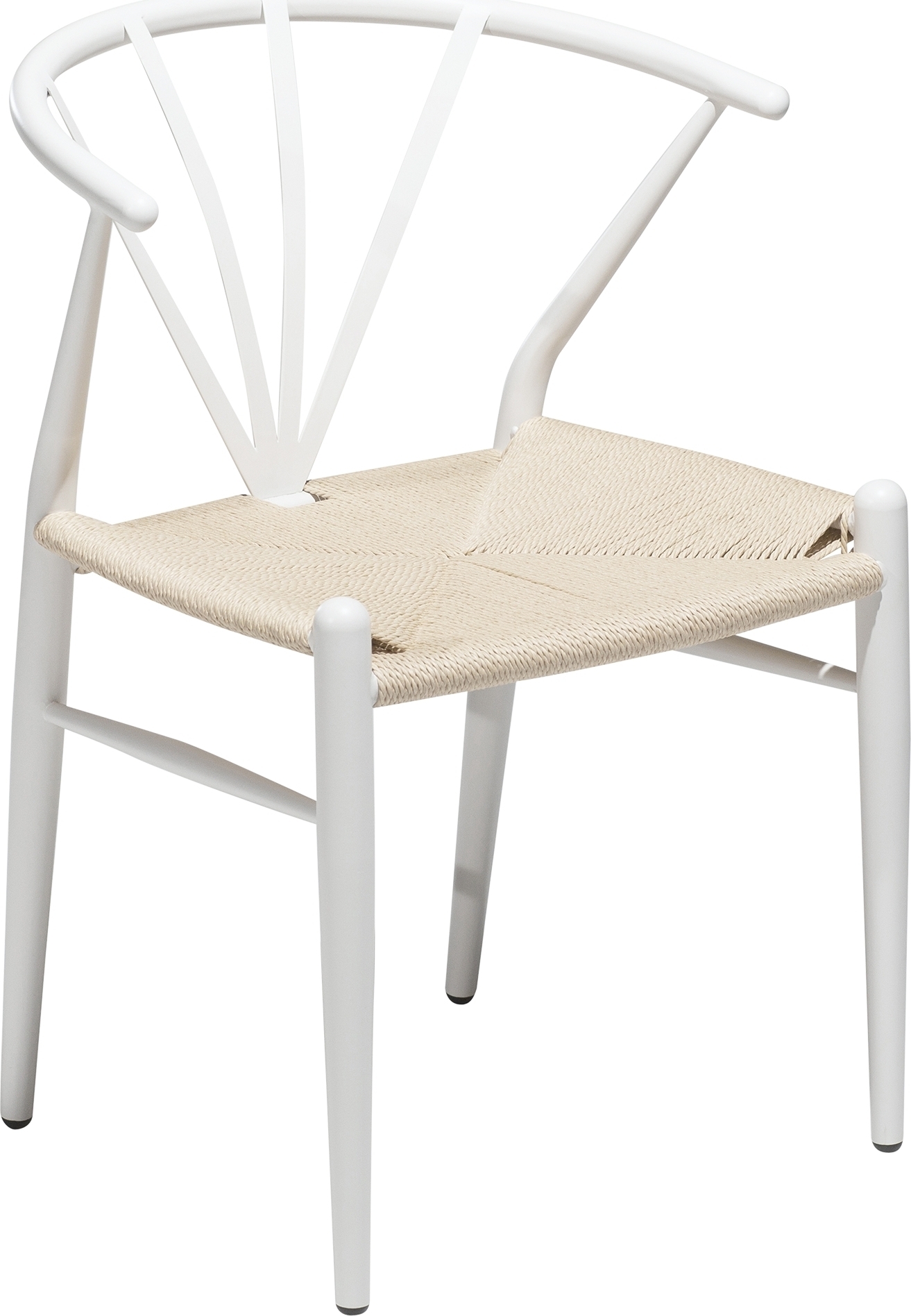 Modernt designad stol från danska Dan-Form. Stommen är tillverkad i vitlackad metall och sitsen är vävd av naturfärgat pappersrep. Tack vare den rundade formen på ryggen är stolen trots sin minimalistiska design mycket bekväm och fungerar utmärkt till långa middagar med familj och vänner.
