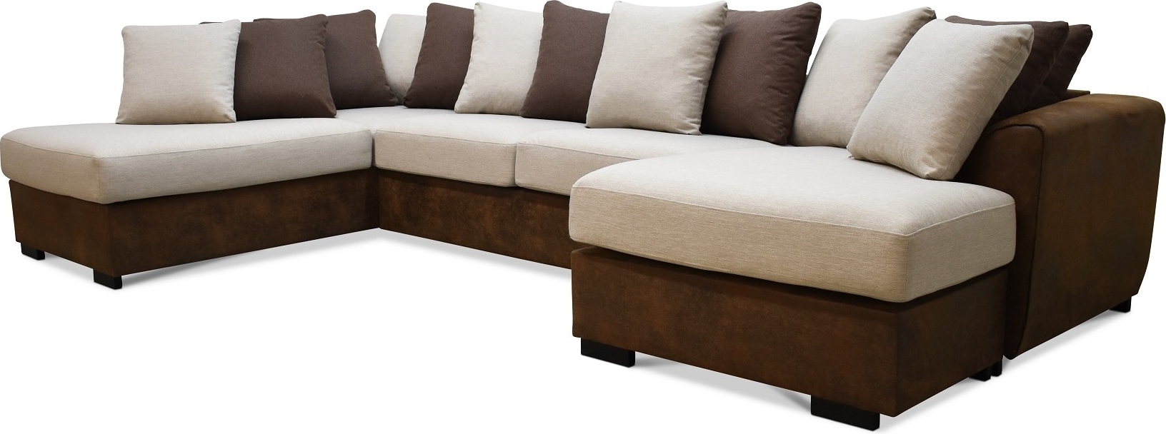Delux U-soffa med öppet avslut är den perfekta soffan för det moderna hemmet med en twist av vintage-design. En stilren soffa av hög kvalitet. Kallskum med 35kg densitet. Klädseln är en blandning av beige och brunt tyg. Stommen är klädd i ett brunfärgat tyg med läderkänsla.