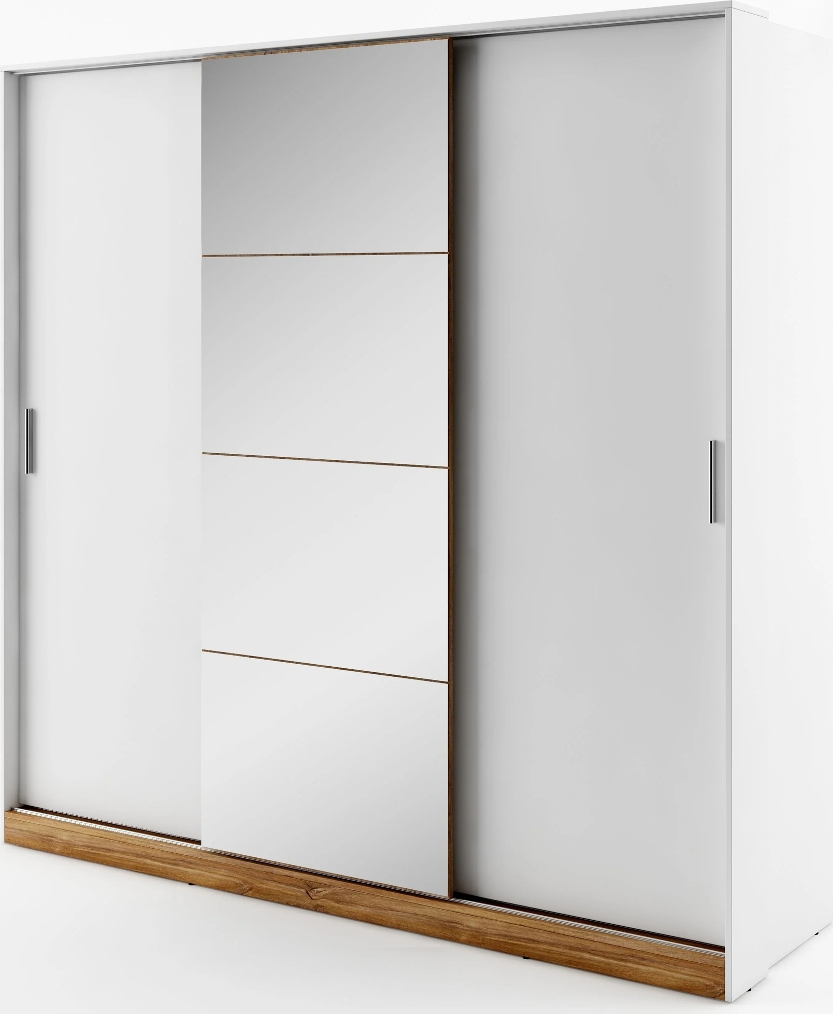 Garderob av trä med 3 skjutdörrar. Den yttersta dörren är försedd med helkroppsspegel. Levereras omonterad.
