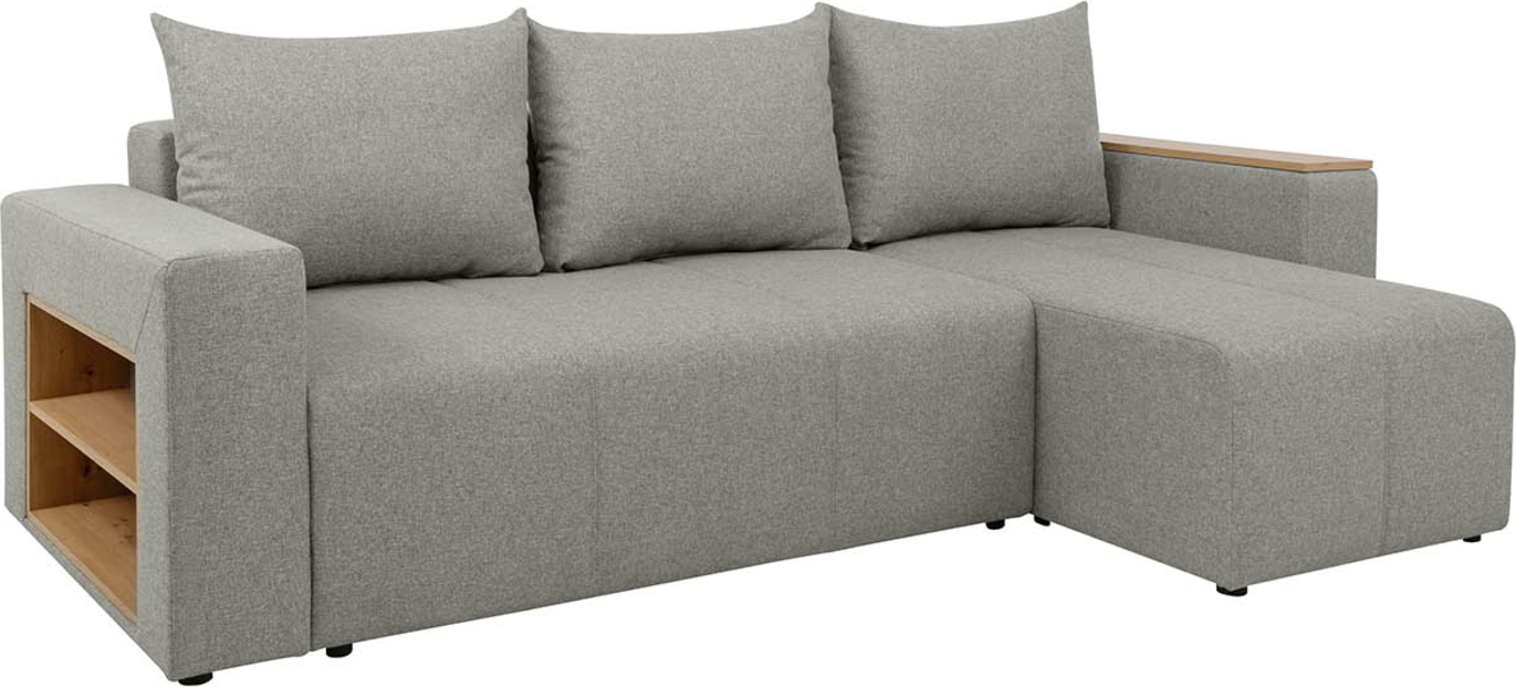 Divansoffa med bäddfunktion och förvaringsutrymme. Ett armstöd har dold förvaring och det andra har hyllor. Divanens placering väljs vid montering.