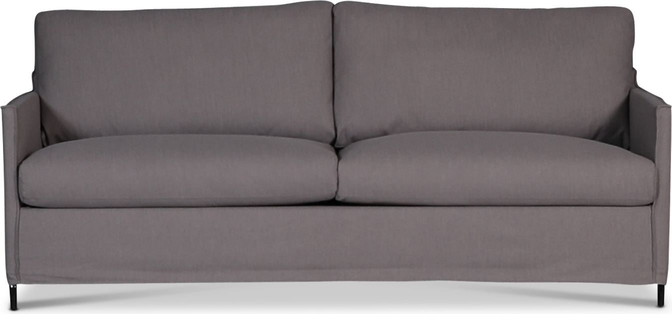 Soffan är en slank och modern modell. Klädsel på soffan är avtagbar och sydd med utåtvända sömnadskanter som en fräck detalj. Soffans tyg är ett mjukt linneliknande tyg i gråbrun färg.