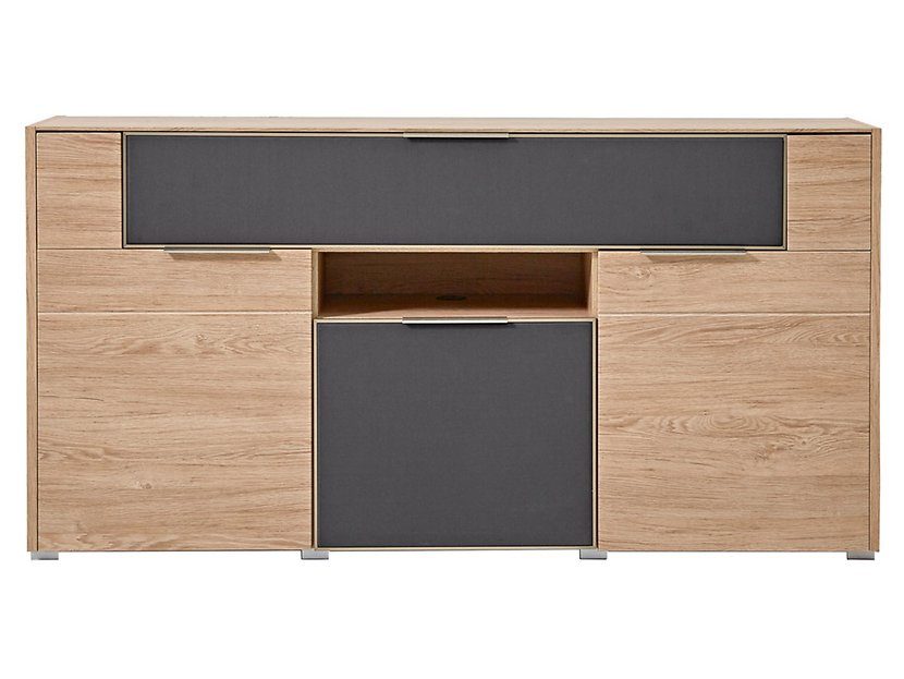 Elegant och rymlig sideboard i ek-imitation med tyg i antracit på två fronter. Erbjuder rikligt med förvaring bakom alla dörrar, dessa är utrustade med en funktion för mjuk stängning.